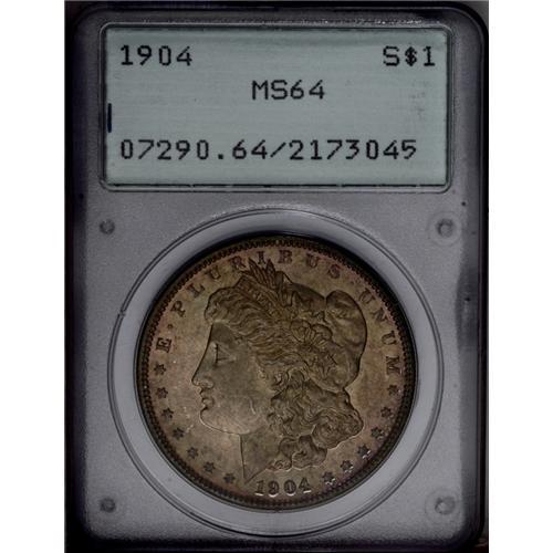 <B>1904<img border='0' src='http://www.heritagecoins.com/images/star.gif' width=10 height=10>$1 MS64 PCGS.</B></I> This crisply struck Choice Morgan dollar features dusky olive-green and cherry-red toning. Surprisingly difficult to acquire in finer grades. Certified in a first generation PCGS holder.