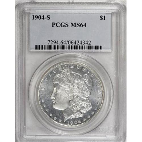<B>1904-S $1 MS64 PCGS.</B></I> Although undesignated as Prooflike by PCGS, the present piece has mildly reflective fields, especially on the obverse. A hint of almond-gold graces the portrait, but this better date dollar is generally brilliant. A few moderate left obverse marks barely merit mention.<BR><BR><B>Coin Engraver:</B> George T. Morgan<BR><BR><b>Shipping:</b> Coins & Currency (<a target="_blank" href="http://www.heritageauctions.com/common/shipping.php">view shipping information</a>)