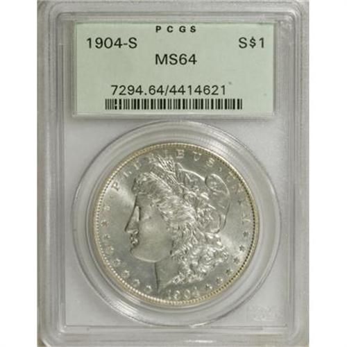 <B>1904-S $1 MS64 PCGS.</B></I> A wonderful Choice Mint State piece that exhibits satiny silver luster on both sides. Slight central weakness is typical for the date. Liberty's cheek and neck are especially clean, and nearly void of unsightly marks. Housed in an older green-label holder, this piece is exceptional for the grade. It may even be a candidate for another look by the grading service.<BR><BR><B>Coin Engraver:</B> George T. Morgan<BR><BR><b>Shipping:</b> Coins & Currency (<a target="_blank" href="http://www.heritageauctions.com/common/shipping.php">view shipping information</a>)