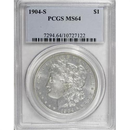 <B>1904-S $1 MS64 PCGS.</B></I> A moderately prooflike near-Gem that exhibits only faint tan-gold toning. Marks are inconsequential save for moderate contact on Liberty's nose and the eagle's breast. The fields are splendidly undisturbed. The first L in DOLLAR has a small spot. Nicely struck, and an affordable alternative to the rarely encountered fully prooflike 1904-S.<BR><I>From The Silver Spur Collection of Morgan Dollars.</B></I><BR><BR><B>Coin Engraver:</B> George T. Morgan<BR><BR><b>Shipping:</b> Coins & Currency (<a target="_blank" href="http://www.heritageauctions.com/common/shipping.php">view shipping information</a>)