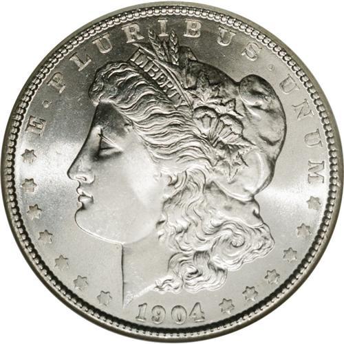 <B>1904<img border='0' src='http://www.heritagecoins.com/images/star.gif' width=10 height=10>$1> MS65 NGC.</B></I> A splendid-looking, bright, silver-white Gem. Entirely untoned and boldly struck, with typical C4 flatness on the eagle's breast and well preserved, minimally abraded surfaces. The 1904 is very elusive, and underrated in MS65 condition. Census: 75 in 65, 4 finer (2/06).