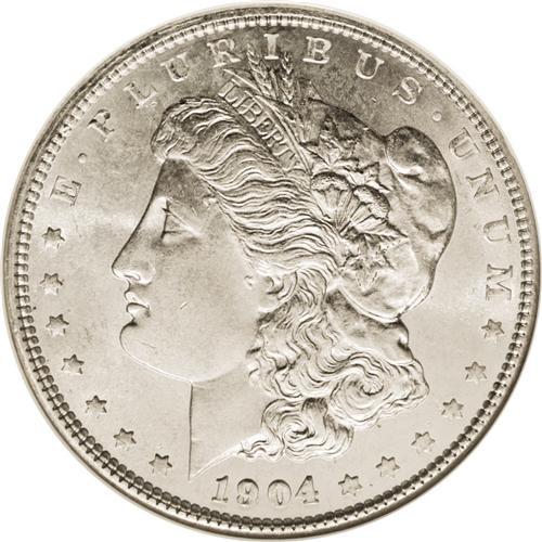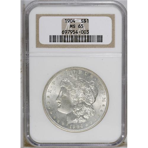 <B>1904<img border='0' src='http://www.heritagecoins.com/images/star.gif' width=10 height=10>$1> MS65 NGC.</B></I> The 1904 is usually available in the lower grades of Uncirculated, but it is seldom seen in Gem condition. This is primarily because the luster is substandard, and the striking quality less-than-satisfactory. This particular piece has bright mint luster and surprisingly strong definition in the centers (for a coin struck from the C4 reverse). Mostly brilliant, there are only slight abrasions scattered about, none of which are of individual significance.