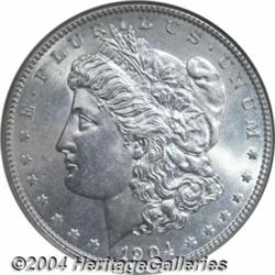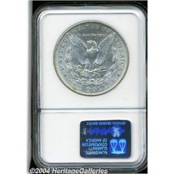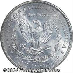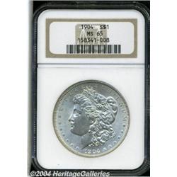 <B>1904<S$1> MS65 NGC.</B></I> A wisp of tan color in the centers precludes full brilliance. A satiny Gem that is well struck except for a hint of softness on the left borders. Both sides are remarkably free of contact. The final year of the 'high relief' Morgan Dollar design, although mintages briefly resumed seventeen years later in a newly engraved, lower relief format. Population: 64 in 65, 3 finer (5/04). <BR><BR><B>Important notice:</B> Heritage usually auctions material at the rate of 200-250 lots per hour. On some occasions eBay Live bid software or the Internet may not be able to keep up with the pace of the auction. We recommend placing a realistic absentee bid now as insurance to avoid disappointment. Occasionally the auctioneer may eliminate or reject an eBay Live bid, and the auctioneer may also reopen a lot after the close of the eBay live bidding (usually because we missed an audience bid), and may reject your bid even if it shows you as the winning bidder. By bidding via eBay Live, you agree that Heritage may award the lot to another bidder at its sole discretion under the circumstances described above or any other reasonable circumstances. Since eBay bids are not shown to us until we open the lot on the floor, we treat those bids just like floor bids. In most cases the floor responds before the eBay bid is presented to us, due to Internet lag time, so for consistency we have made it a policy that floor bids are always considered first over tie eBay live bids. Also please note that all Heritage lots purchased through eBay Live carry a 20% Buyer's Premium. Please make sure you read the Terms and Conditions before you bid. </span></font></tr></table></td></tr></table>