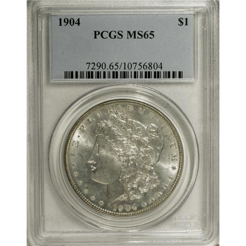 <B>1904 S$1 MS65 PCGS.</B></I> The 1904 dollar is readily available through the MS64 level, but becomes elusive in Gem condition. The surfaces are fully lustrous, and visited by occasional whispers of reddish-tan color. A sharp strike characterizes the design features, including nearly full definition in the hair over Liberty's ear and on the eagle's breast feathers. A few minute obverse marks are not bothersome.<BR><BR><b>Shipping:</b> Coins & Currency (<a target="_blank" href="http://www.heritageauctions.com/common/shipping.php">view shipping information</a>)