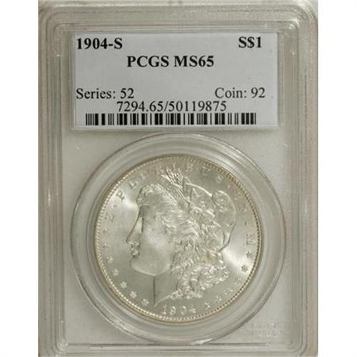 <B>1904-S $1 MS65 PCGS.</B></I> The 1904-S Gem in this lot displays dazzling luster and just a few wisps of light gold color that shows up under magnification. The design elements are sharply impressed, including good clarity on the eagle's breast feathers and partial definition in the hair at Liberty's ear. Both sides possess a satiny finish, and a few minor marks and luster grazes that preclude an even higher grade. David Bowers, (2005) calls this issue one of the keys in the series.<BR><I>From The Arnold & Harriet Collection, Part Two.</B></I><BR><BR><B>Coin Engraver:</B> George T. Morgan<BR><BR><b>Shipping:</b> Coins & Currency (<a target="_blank" href="http://www.heritageauctions.com/common/shipping.php">view shipping information</a>)