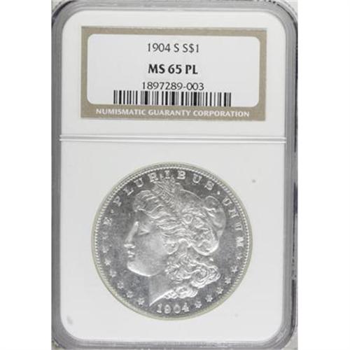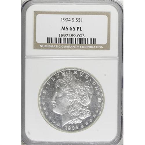 <B>1904-S $1 MS65 Prooflike NGC.</B></I> Solidly struck with shallow-mirrored fields that achieve a mild contrast with the central devices. Die striations help to promote the illusion of prooflike reflectivity on both sides. Slight cloudiness and a few minor marks preclude an even finer grade assessment; but this Gem is one of a mere five coins to be certified as MS65 Prooflike, by NGC, with none finer (6/07). <BR><I>From the Reuben Reinstein Collection.</B></I><BR><BR><b>Shipping:</b> Coins & Currency (<a target="_blank" href="http://www.heritageauctions.com/common/shipping.php">view shipping information</a>)
