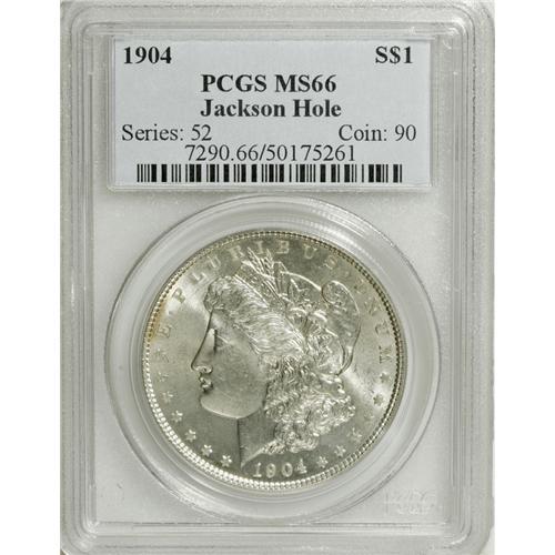 <B>1904 S$1 MS66 PCGS.</B></I> Ex: Jackson Hole. In his <I>Morgan And Peace Dollar Textbook,</B></I> Wayne Miller decries the production quality of this issue, stating: "The typical 1904-P dollar has dull, drab luster and plentiful abrasions." Obviously, the currently offered Premium Gem represents an exception to this observation. Although the luster is not outstanding, it is certainly adequate, and pleasing cartwheels abound on both sides. The design elements are well struck, and surface disruptions are minimal. Population: 13 in 66, 0 finer at either service (2/07).<BR><I>From The Jackson Hole Collection.</B></I><BR><BR><b>Shipping:</b> Coins & Currency (<a target="_blank" href="http://www.heritageauctions.com/common/shipping.php">view shipping information</a>)