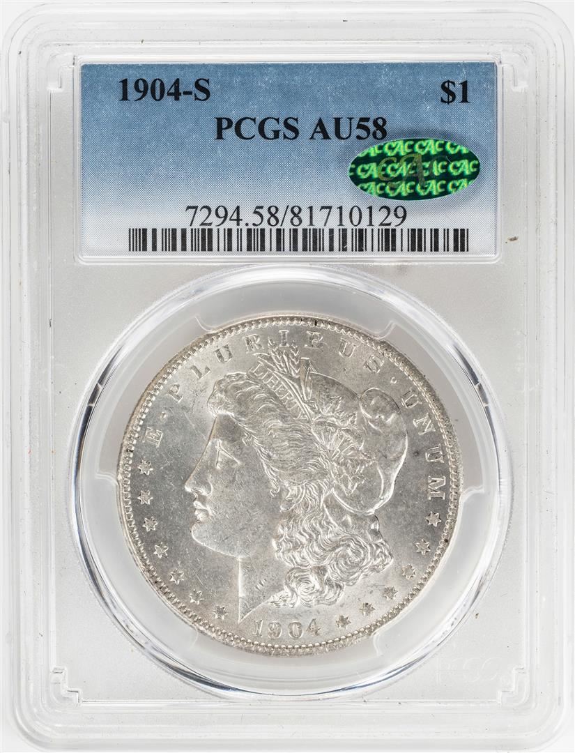 One 1904-S $1 Morgan Silver Dollar Coin PCGS AU58 CAC. PCGS Graded.