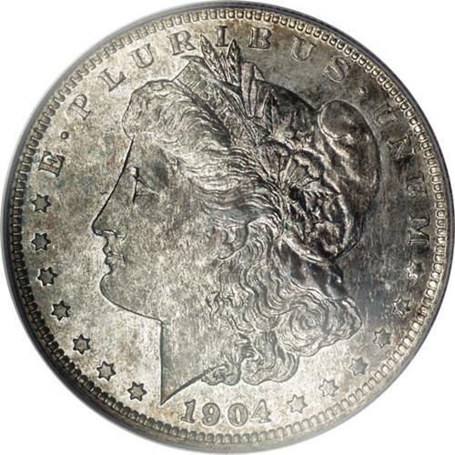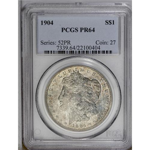 <B>1904<img border='0' src='http://www.heritagecoins.com/images/star.gif' width=10 height=10>$1> PR64 PCGS.</B></I> The surfaces of this specimen have partially polished portraits, which is characteristic of Proof dollars of this era, rather than frosty or cameo-like motifs. Both sides have mottled olive-green, aqua-green, and lavender patination, and the design features are exquisitely struck. A few wispy slidemarks are noted on the eagle's breast and wings. Population: 70 in 64, 42 finer (3/06). <BR><BR><B>Important notice:</B> Heritage usually auctions material at the rate of 200-250 lots per hour. On some occasions eBay Live bid software or the Internet may not be able to keep up with the pace of the auction. We recommend placing a realistic absentee bid now as insurance to avoid disappointment. Occasionally the auctioneer may eliminate or reject an eBay Live bid, and the auctioneer may also reopen a lot after the close of the eBay live bidding (usually because we missed an audience bid), and may reject your bid even if it shows you as the winning bidder. By bidding via eBay Live, you agree that Heritage may award the lot to another bidder at its sole discretion under the circumstances described above or any other reasonable circumstances. Since eBay bids are not shown to us until we open the lot on the floor, we treat those bids just like floor bids. In most cases the floor responds before the eBay bid is presented to us, due to Internet lag time, so for consistency we have made it a policy that floor bids are always considered first over tie eBay live bids. Also please note that all Heritage lots purchased through eBay Live carry a 20% Buyer's Premium. Please make sure you read the Terms and Conditions before you bid. This lot is being auctioned in conjunction with a live floor auction by Heritage Galleries & Auctioneers. All final auction and invoice information will be supplied by Heritage Galleries & Auctioneers, and all other information should be considered preliminary. Lot:3813 <BR><BR><B>Winning Notification and Billing:</B> After the FINAL session in this auction is complete, Heritage will send e-mail and snail mail invoices. This process normally takes several days. All final auction and invoice information will be supplied by Heritage Galleries & Auctioneers, and all other information should be considered preliminary. <BR><BR>This auction will be conducted on a live auction floor and over the Internet through eBay Live. If you choose to place an absentee bid, please take a moment to <font color='#0000ff'><u><a href='http://pages.ebay.com/liveauctions/help/before/laabsentee.html'>learn how eBay Live absentee bidding works</a></u></font><font color='#000000'>