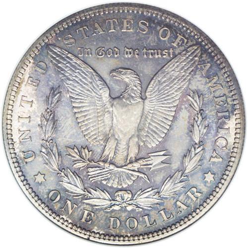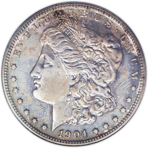 <B>1904<img border='0' src='http://www.heritagecoins.com/images/star.gif' width=10 height=10>$1> PR65 NGC.</B></I> Moderately toned on each side in shades of steel-blue, antique-golden, and magenta, this coin also possesses highlights of champagne, ice-blue and crimson that dance from the surfaces when it is rotated under a light. Full reflectivity is clearly evident beneath the toning. The only distractions are a few minor marks on Liberty's cheek and dark toning spot over the R of PLURIBUS. A lovely Gem proof that should generate considerable interest from aficionados of toned coins.