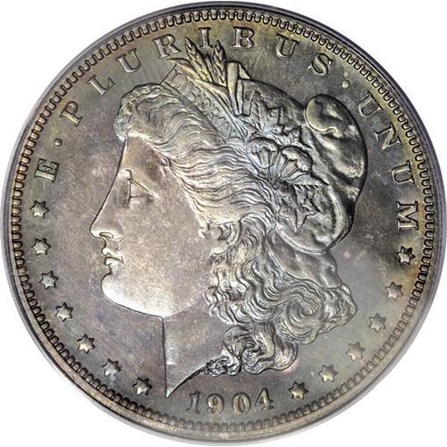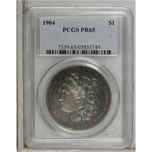 <B>1904 S$1 PR65 PCGS.</B></I> The 650 proof dollars struck in 1904 represent the last proof Morgan dollars offered to the general public, and the last specimen strikings aside from the tiny mintages that comprise the Zerbe and Chapman proofs of 1921. Each side of this Gem displays rich russet-based patina overall. Blue-tinged and olive-colored areas surround the portrait on the obverse, while the reverse exhibits cerulean and violet accents as well as a small area on the breast and right (facing) wing that remains largely untoned. Boldly defined overall, though the hair above the ear displays a touch of softness. Population: 28 in 65, 16 finer (2/07).<BR><BR><b>Shipping:</b> Coins & Currency (<a target="_blank" href="http://www.heritageauctions.com/common/shipping.php">view shipping information</a>)