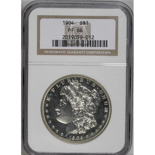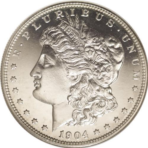 <B>1904<img border='0' src='http://www.heritagecoins.com/images/star.gif' width=10 height=10>$1> PR66 NGC.</B></I> A magnificent proof specimen that is completely untoned and exhibits deep, glassy mirrors that do not substantially differ from fields to devices. The strike wanes slightly over the highest points, but there are no mentionable marks, spots, or other distractions. Census: 38 in 66, 19 finer (6/06).