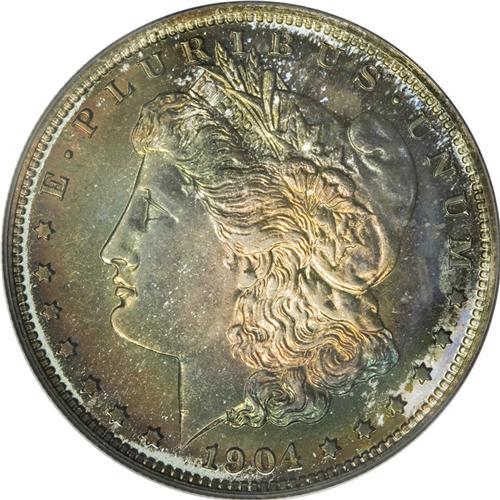 <B>1904 S$1 PR67 PCGS.</B></I> Ex: JFS Collection. This is a stunning Superb Gem proof with small areas of brilliance on each side. Most of the obverse and reverse surfaces are toned with a wonderful display of gold, sea-green, and cobalt-blue iridescence. Underneath the toning, we see extremely deep mirrored surfaces with evidence of lustrous devices. There is a distinct appearance of cameo contrast between the fields and devices, although the toning prevents an exact analysis. Perhaps it is worth noting that PCGS has never certified a Cameo or Deep Cameo example of this date. Population: 4 in 67, 0 finer (2/07).<BR><BR><b>Shipping:</b> Coins & Currency (<a target="_blank" href="http://www.heritageauctions.com/common/shipping.php">view shipping information</a>)