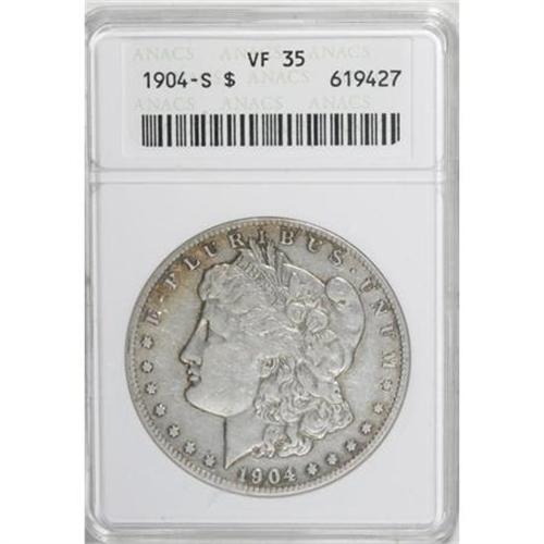 <B>1904-S $1 VF35 ANACS.</B></I> . NGC Census: (47/1035). PCGS Population (75/1577). Mintage: 2,304,000. Numismedia Wsl. Price for NGC/PCGS coin in VF35: $136. (#7294)<BR><BR><B>Coin Engraver:</B> George T. Morgan<BR><BR><b>Shipping:</b> Coins & Currency (<a target="_blank" href="http://www.heritageauctions.com/common/shipping.php">view shipping information</a>)