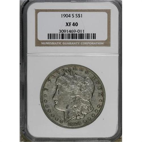 <B>1904-S $1 XF40 NGC.</B></I> NGC Census: (84/952). PCGS Population (105/1481). Mintage: 2,304,000. Numismedia Wsl. Price for NGC/PCGS coin in XF40: $183. (#7294)<BR><BR><B>Coin Engraver:</B> George T. Morgan<BR><BR><b>Shipping:</b> Coins & Currency (<a target="_blank" href="http://www.heritageauctions.com/common/shipping.php">view shipping information</a>)