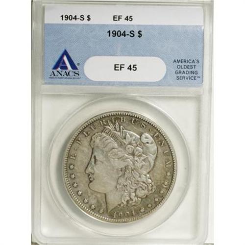 <B>1904-S $1 XF45 ANACS.</B></I> NGC Census: (178/751). PCGS Population (142/1296). Mintage: 2,304,000. Numismedia Wsl. Price for NGC/PCGS coin in XF45: $268. (#7294)<BR><BR><B>Coin Engraver:</B> George T. Morgan<BR><BR><b>Shipping:</b> Coins & Currency (<a target="_blank" href="http://www.heritageauctions.com/common/shipping.php">view shipping information</a>)