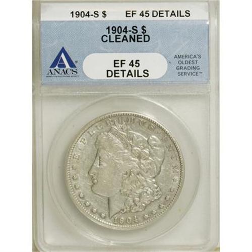 <B>1904-S $1 --Cleaned--ANACS. XF45 Details.</B></I> NGC Census: (183/773). PCGS Population (153/1341). Mintage: 2,304,000. Numismedia Wsl. Price for NGC/PCGS coin in XF45: $273. (#7294)<BR><BR><B>Coin Engraver:</B> George T. Morgan<BR><BR><b>Shipping:</b> Coins & Currency (<a target="_blank" href="http://www.heritageauctions.com/common/shipping.php">view shipping information</a>)
