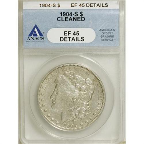 <B>1904-S $1 --Cleaned--ANACS. XF45 Details.</B></I> NGC Census: (183/773). PCGS Population (153/1341). Mintage: 2,304,000. Numismedia Wsl. Price for NGC/PCGS coin in XF45: $273. (#7294)<BR><BR><B>Coin Engraver:</B> George T. Morgan<BR><BR><b>Shipping:</b> Coins & Currency (<a target="_blank" href="http://www.heritageauctions.com/common/shipping.php">view shipping information</a>)