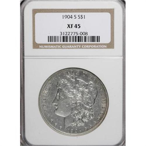 <B>1904-S $1 XF45 NGC.</B></I> NGC Census: (182/771). PCGS Population (148/1335). Mintage: 2,304,000. Numismedia Wsl. Price for NGC/PCGS coin in XF45: $273. (#7294)<BR><BR><B>Coin Engraver:</B> George T. Morgan<BR><BR><b>Shipping:</b> Coins & Currency (<a target="_blank" href="http://www.heritageauctions.com/common/shipping.php">view shipping information</a>)