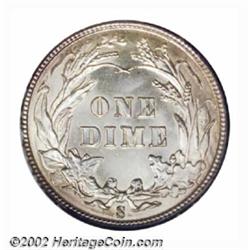 1904-S 10C MS64 NGC. The 1904-S is a scarce, semi-key issue with only 800,000 pieces struck. Soft, frosted mint luster swirls around each side with light golden accents around the margins and brilliant centers. Population: 15 in 64, 4 finer (7/02). Important notice: We expect to be auctioning lots at the rate of 200-250 per hour. Sometimes eBay Premier live bid software cannot keep up with that pace, so we strongly recommend that you place a realistic proxy bid now as insurance to avoid disappointment. Also please note that all Heritage/CAA lots purchased through eBay Premier carry a 20% Buyer's Premium. Please make sure you read the Terms and Conditions.