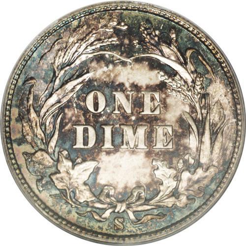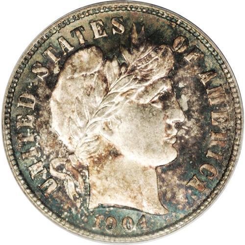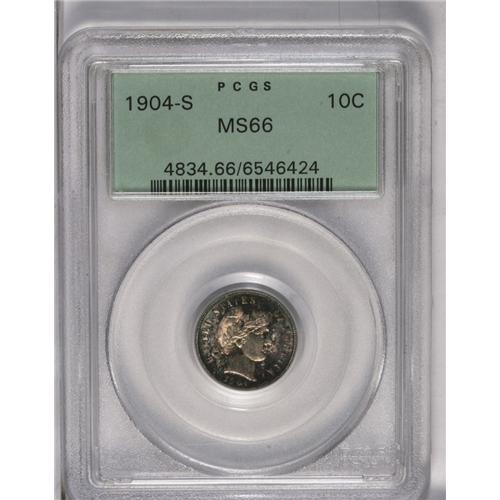 <B>1904-S<10C> MS66 PCGS.</B></I> The fields and peripheries have speckles of purple and electric-blue patina, while the central devices are nearly untoned. A well struck representative with bright, satiny luster and pleasing surface preservation. Only 800,000 dimes were produced at the San Francisco Mint in 1904, and remaining survivors are difficult to obtain in high grades. Population: 7 in 66, 1 finer (6/06).<BR><I>From The Belle Glade Collection.</B></I> <BR><BR><B>Important
