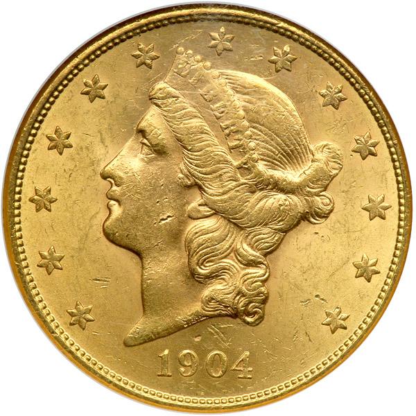1904-S $20 Liberty. NGC graded MS-63. Mostly untoned, a lustrous example with average detail in the upper hair and coronet where LIBERTY merges into the pearl border. A few small marks in the field and on the eyebrow and cheek. Also has a small scuff near the N in TWENTY on the reverse (PCGS # 9046) .