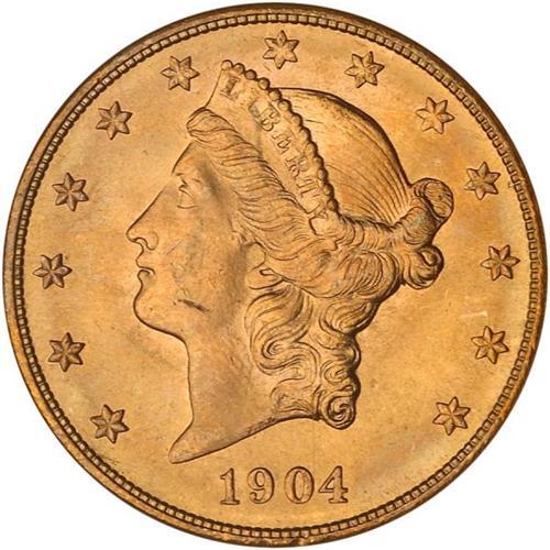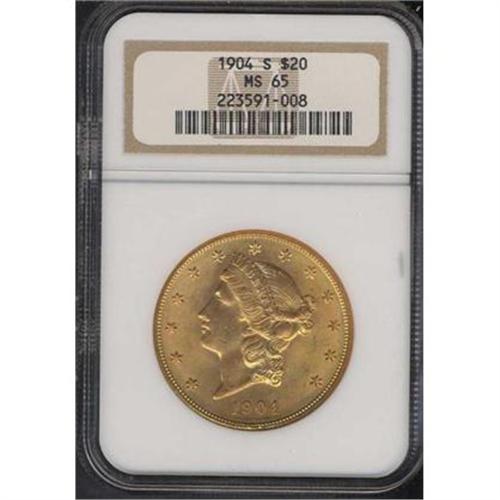 <b>1904-S $20 Liberty. NGC graded MS65.</b> Highly radiant and largely bright with warm golden orange highlights on both sides. All but fully struck, with just an insubstantial touch of weakness at couple of the stars above Liberty. Mint-fresh gem quality surfaces and luster like this are extremely desirable today. Year ago they were prized. And years hence they will continue to be admired by generations of collectors <b>(PCGS # 9046)</b> <i>