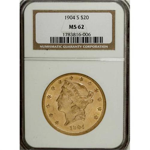<B>1904-S $20 MS62 NGC.</B></I> NGC Census: (6016/9768). PCGS Population (5113/7160). Mintage: 5,134,175. Numismedia Wsl. Price for NGC/PCGS coin in MS62: $740. (#9046)<BR><BR><B>Coin Engraver:</B> James B. Longacre<BR><BR><b>Shipping:</b> Coins & Currency (<a target="_blank" href="http://www.heritageauctions.com/common/shipping.php">view shipping information</a>)
