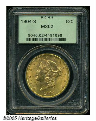 <B>1904-S<$20> MS62 PCGS.</B></I> A lustrous and moderately marked older holder type coin with a well preserved reverse. Seen less often than the 1904, despite a similar sizable production.