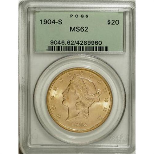 <B>1904-S $20 MS62 PCGS.</B></I> PCGS Population (5352/7506). NGC Census: (6123/9878). Mintage: 5,134,175. Numismedia Wsl. Price for NGC/PCGS coin in MS62: $925. (#9046)<BR><BR><B>Coin Engraver:</B> James B. Longacre<BR><BR><b>Shipping:</b> Coins & Currency (<a target="_blank" href="http://www.heritageauctions.com/common/shipping.php">view shipping information</a>)