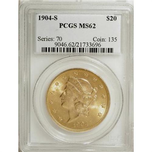 <B>1904-S $20 MS62 PCGS.</B></I> PCGS Population (5353/7534). NGC Census: (6126/9888). Mintage: 5,134,175. Numismedia Wsl. Price for NGC/PCGS coin in MS62: $925. (#9046)<BR><BR><B>Coin Engraver:</B> James B. Longacre<BR><BR><b>Shipping:</b> Coins & Currency (<a target="_blank" href="http://www.heritageauctions.com/common/shipping.php">view shipping information</a>)