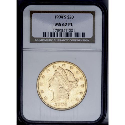 <B>1904-S<$20> MS62 Prooflike NGC.</B></I> A shining and sharply struck example. The wheat-honey surfaces have scattered abrasions that restrict the grade, yet this coin's eye appeal is still strong. Perfect for the enthusiast who wants to add something extra to a collection.<BR><I>From The New York Eye Appeal Collection.</B></I>