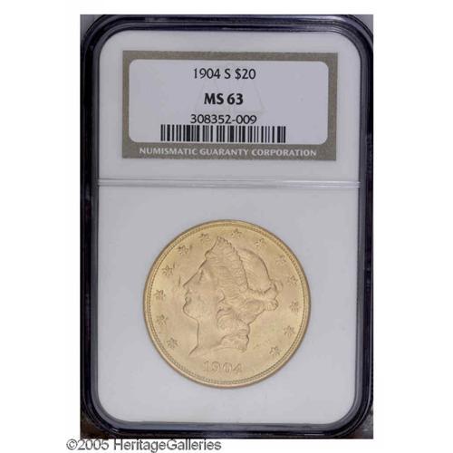 1904-S $20 MS63 NGC. Light orange toning with cartwhee 1904-S[$20] MS63 NGC.