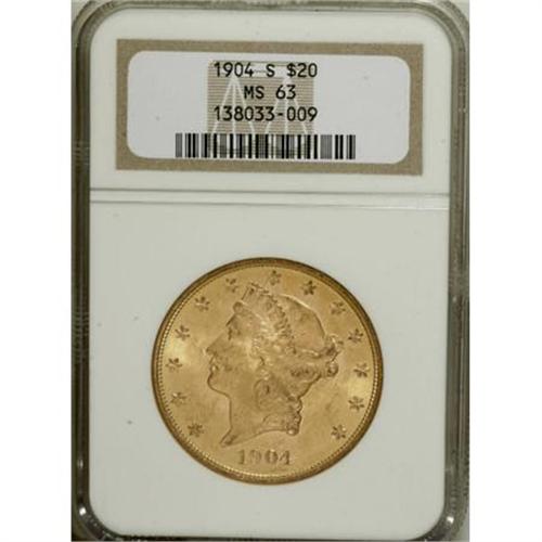 <B>1904-S $20 MS63 NGC.</B></I> NGC Census: (6727/3041). PCGS Population (4663/2568). Mintage: 5,134,175. Numismedia Wsl. Price for NGC/PCGS coin in MS63: $890. (#9046)<BR><BR><B>Coin Engraver:</B> James B. Longacre<BR><BR><b>Shipping:</b> Coins & Currency (<a target="_blank" href="http://www.heritageauctions.com/common/shipping.php">view shipping information</a>)