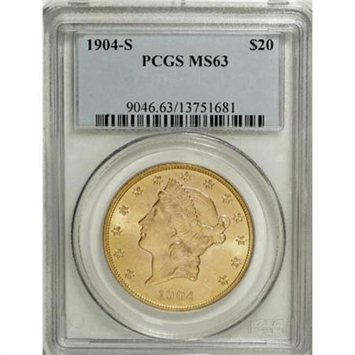 <B>1904-S $20 MS63 PCGS.</B></I> PCGS Population (4637/2523). NGC Census: (6727/3041). Mintage: 5,134,175. Numismedia Wsl. Price for NGC/PCGS coin in MS63: $890. (#9046)<BR><BR><B>Coin Engraver:</B> James B. Longacre<BR><BR><b>Shipping:</b> Coins & Currency (<a target="_blank" href="http://www.heritageauctions.com/common/shipping.php">view shipping information</a>)