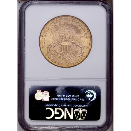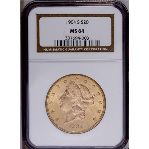 <B>1904-S<$20> MS64 NGC.</B></I> Sharply struck on the design features, and honey-gold lustrous surfaces. Light abrasions on Liberty's cheek and neck, and scuffs in the fields on both sides, define the grade.