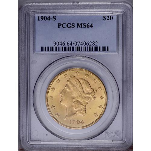 <B>1904-S<$20> MS64 PCGS.</B></I> A bright peach-gold and green-gold near-Gem with extensive luster and consistently sharp striking details. A handful of superficial coin-to-coin marks are scattered over each side, limiting the grade to MS64. A visually pleasing example of this late San Francisco issue.