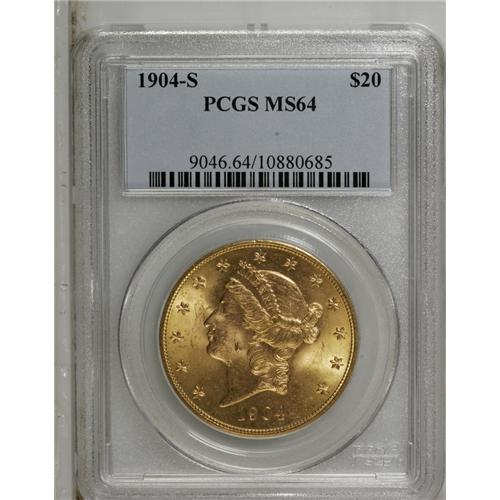 <B>1904-S $20 MS64 PCGS.</B></I> A highly lustrous yellow-gold piece that has lovely orange accents on the reverse. Solidly struck with a few scattered marks on each side.<BR><BR><b>Shipping:</b> Coin/Currency (<a target="_blank" href="http://www.heritageauctions.com/common/shipping.php">view shipping information</a>)