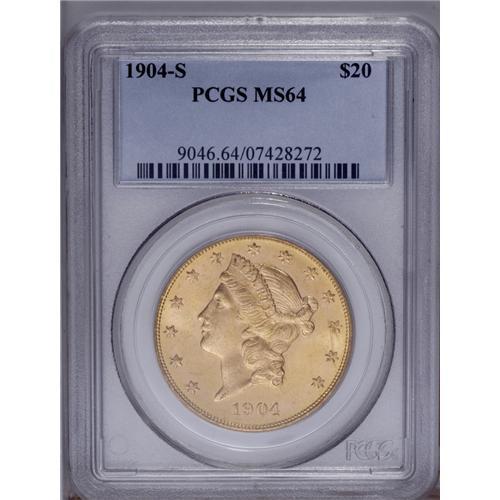 <B>1904-S $20 MS64 PCGS.</B></I> Although not so noted on the holder, the fields on both sides are fairly prooflike, with brilliant cartwheel luster. While there are more light contact marks noted with a loupe than many other examples at this grade level, the superior surfaces compensate. The strike is pleasing, although stars 5 and 6 lack central detail.