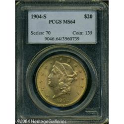 1904-S $20 MS64 PCGS. Bright apricot-gold color wi <B>1904-S $20 MS64 PCGS.</B></I> Bright apricot-gold color with nice luster and sharply defined motifs. A few miniscule marks are noted on Liberty's face. <BR><BR><B>Important notice:</B> Heritage usually auctions material at the rate of 200-250 lots per hour. On some occasions eBay Live bid software or the Internet may not be able to keep up with the pace of the auction. We recommend placing a realistic absentee bid now as insurance to avoid disappointment. Occasionally the auctioneer may eliminate or reject an eBay Live bid, and the auctioneer may also reopen a lot after the close of the eBay live bidding (usually because we missed an audience bid), and may reject your bid even if it shows you as the winning bidder. By bidding via eBay Live, you agree that Heritage may award the lot to another bidder at its sole discretion under the circumstances described above or any other reasonable circumstances. Since eBay bids are not shown to us until we open the lot on the floor, we treat those bids just like floor bids. In most cases the floor responds before the eBay bid is presented to us, due to Internet lag time, so for consistency we have made it a policy that floor bids are always considered first over tie eBay live bids. Also please note that all Heritage lots purchased through eBay Live carry a 20% Buyer's Premium. Please make sure you read the Terms and Conditions before you bid. This lot is being auctioned in conjunction with a live floor auction by Heritage Galleries & Auctioneers. All final auction and invoice information will be supplied by Heritage Galleries & Auctioneers, and all other information should be considered preliminary. Lot:7052