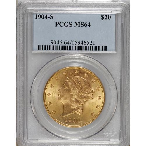 <B>1904-S $20 MS64 PCGS.</B></I> No Type Three San Francisco double eagle has a mintage to rival that of the 1904-S. This slightly satiny and solidly struck wheat-gold piece offers pleasing luster and minimally marked surfaces.<BR><BR><b>Shipping:</b> Coins & Currency (<a target="_blank" href="http://www.heritageauctions.com/common/shipping.php">view shipping information</a>)