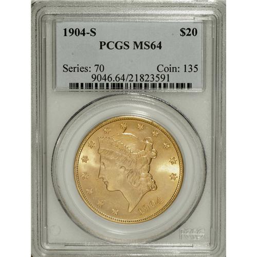 <B>1904-S $20 MS64 PCGS.</B></I> Peach and pale green-gold intermingle across this thoroughly lustrous and well struck near-Gem. The reverse is impressively unblemished, and the left obverse has only a couple of moderate marks.<BR><BR><b>Shipping:</b> Coins & Currency (<a target="_blank" href="http://www.heritageauctions.com/common/shipping.php">view shipping information</a>)