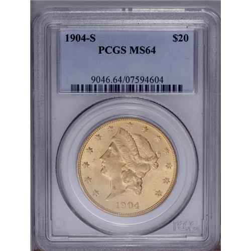 <B>1904-S $20 MS64 PCGS.</B></I> Rich, frosty mint bloom with bold definition and few imperfections. A nice example of this issue for the grade. The 1904-S is the most common Liberty Head double eagle from the San Francisco Mint, but it is scarce above the MS64 grade level.