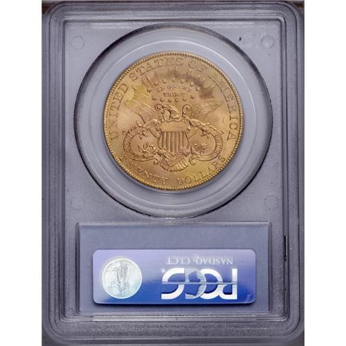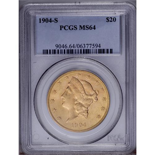 <B>1904-S<$20> MS64 PCGS.</B></I> Tantalizing red-gold color is highlighted by dramatic luster on both sides and the coin overall has a pleasingly fresh appearance. The left obverse and reverse fields are faintly marked by small abrasions that seemingly limit the grade of the piece to MS64.