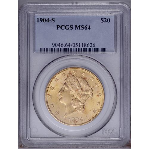 <B>1904-S<$20> MS64 PCGS.</B></I> The bright satiny surfaces are richly effulgent and exhibit dazzling cartwheel luster in the fields. Minimally marked, but with a number of grade-limiting alloy spots scattered over the obverse.