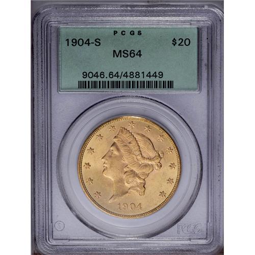 <B>1904-S<$20> MS64 PCGS.</B></I> This older holder type coin exhibits alternating honey and lime-green toning. The reverse is well preserved, while obverse shows relevant contact only on the portrait.