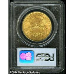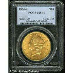 1904-S $20 MS64 PCGS. Vibrant luster and smooth ap <B>1904-S $20 MS64 PCGS.</B></I> Vibrant luster and smooth apricot-gold surfaces are the prime attributes of this lovely high end near-Gem. A well struck example. The 1904-S has a mintage comparable with the 1904, but the latter is much more available today. <BR><BR><B>Important notice:</B> Heritage usually auctions material at the rate of 200-250 lots per hour. On some occasions eBay Live bid software or the Internet may not be able to keep up with the pace of the auction. We recommend placing a realistic absentee bid now as insurance to avoid disappointment. Occasionally the auctioneer may eliminate or reject an eBay Live bid, and the auctioneer may also reopen a lot after the close of the eBay live bidding (usually because we missed an audience bid), and may reject your bid even if it shows you as the winning bidder. By bidding via eBay Live, you agree that Heritage may award the lot to another bidder at its sole discretion under the circumstances described above or any other reasonable circumstances. Since eBay bids are not shown to us until we open the lot on the floor, we treat those bids just like floor bids. In most cases the floor responds before the eBay bid is presented to us, due to Internet lag time, so for consistency we have made it a policy that floor bids are always considered first over tie eBay live bids. Also please note that all Heritage lots purchased through eBay Live carry a 20% Buyer's Premium. Please make sure you read the Terms and Conditions before you bid. This lot is being auctioned in conjunction with a live floor auction by Heritage Galleries & Auctioneers. All final auction and invoice information will be supplied by Heritage Galleries & Auctioneers, and all other information should be considered preliminary. Lot:7049