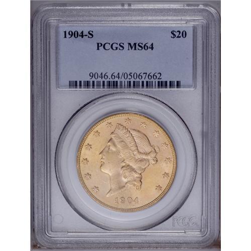 <B>1904-S<$20> MS64 PCGS.</B></I> Well struck with pleasing terra cotta and mint-green toning and full mint luster. A few light marks limit the grade.