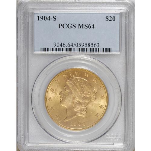 <B>1904-S $20 MS64 PCGS.</B></I> While the 1904 is better known to type collectors, it and the 1904-S are equally suitable for that purpose, since both have generous mintages and high rates of survival. This shining yellow-orange double eagle is well struck with a handful of grade-defining marks, including one in the hair behind the coronet.<BR><BR><b>Shipping:</b> Coins & Currency (<a target="_blank" href="http://www.heritageauctions.com/common/shipping.php">view shipping information</a>)