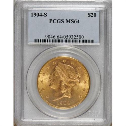 <B>1904-S $20 MS64 PCGS.</B></I> Though overshadowed by its Philadelphia counterpart, the 1904-S double eagle has a titanic mintage in its own right, in excess of 5.1 million pieces. This solidly struck representative offers strong luster and appealing yellow-orange coloration with a touch of haze over the fields. Lightly abraded, yet appealing for the grade.<BR><BR><b>Shipping:</b> Coins & Currency (<a target="_blank" href="http://www.heritageauctions.com/common/shipping.php">view shipping information</a>)